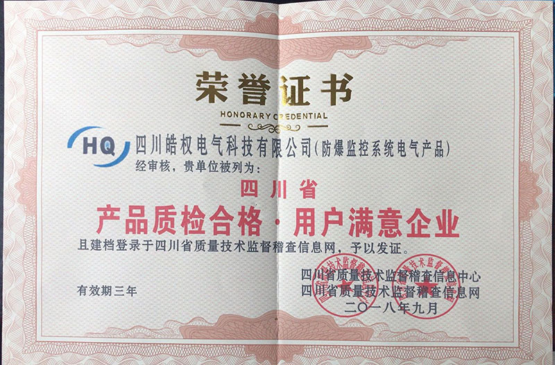 四川皓權(quán)電氣科技有限公司榮獲四川省“產(chǎn)品質(zhì)檢合格·用戶滿意企業(yè)”榮譽(yù)單位