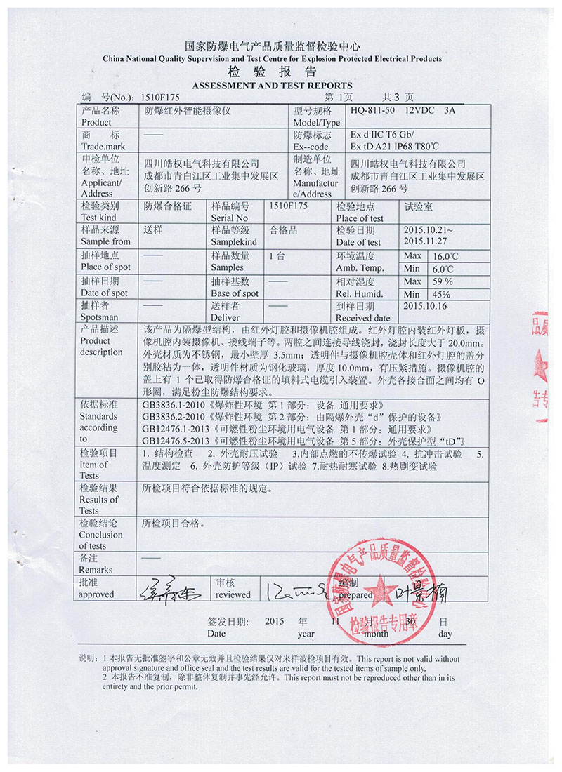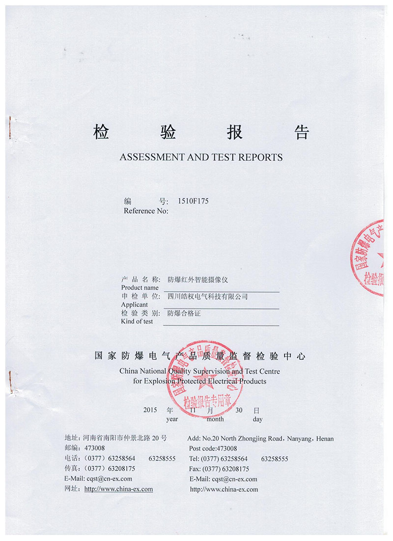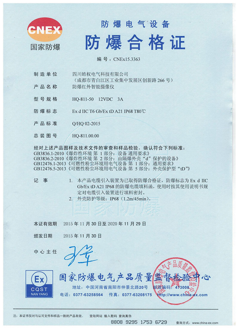 四川皓權電氣科技有限公司的防爆紅外智能攝像儀榮獲 "國家防爆產品合格證"產品