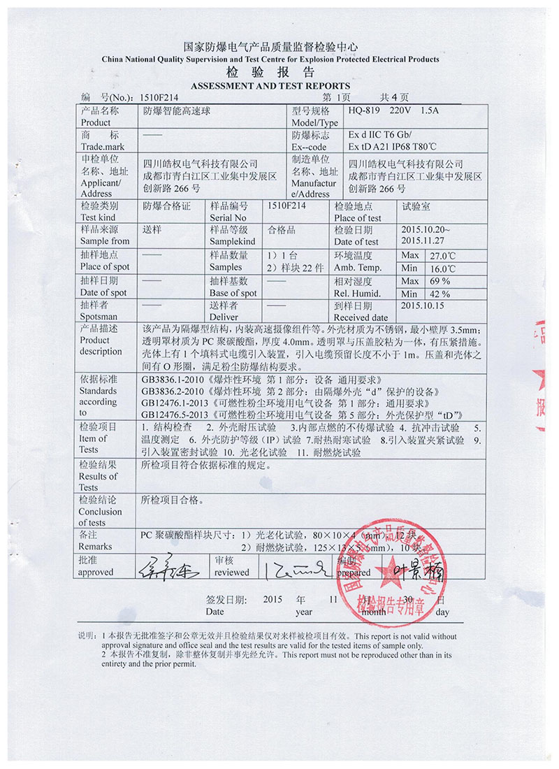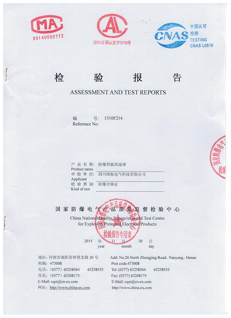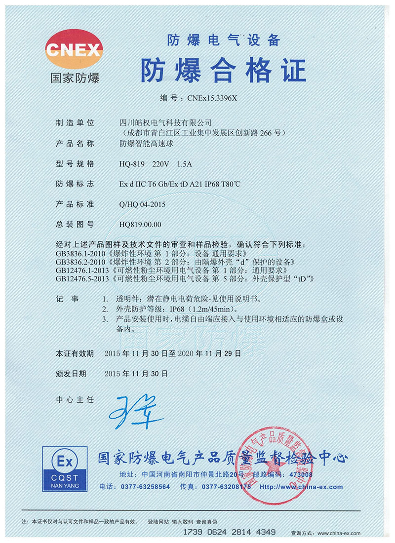 四川皓權(quán)電氣科技有限公司的防爆智能高速球榮獲 "國(guó)家防爆產(chǎn)品合格證"產(chǎn)品