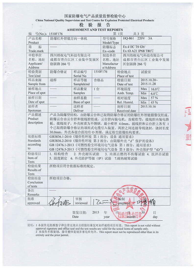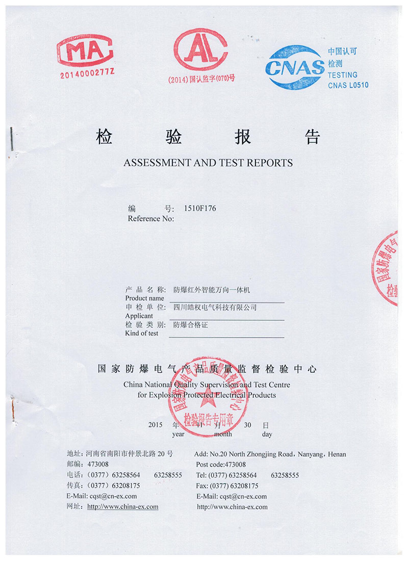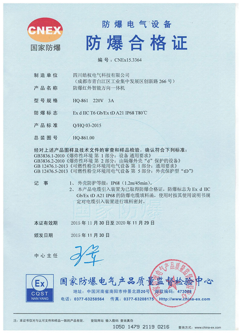 四川皓權(quán)電氣科技有限公司的防爆紅外智能萬向一體機榮獲 "國家防爆產(chǎn)品合格證"產(chǎn)品